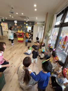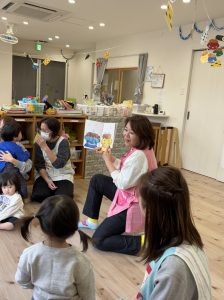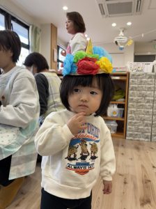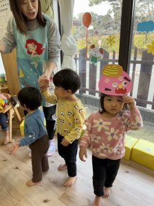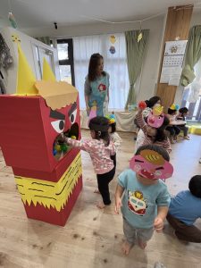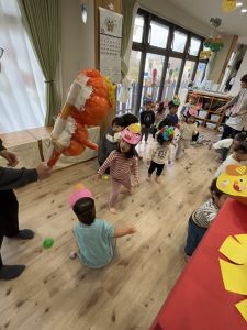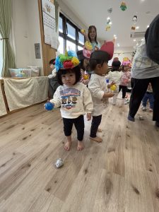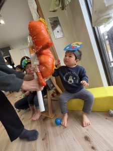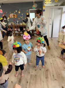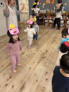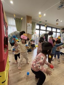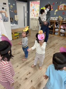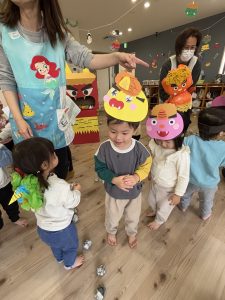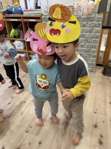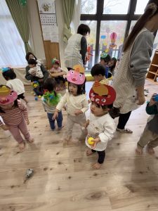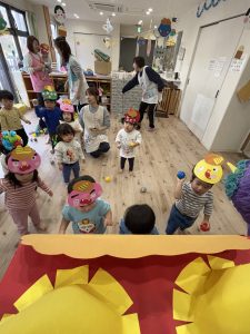 絵本を見た後は、子どもたち手作りのお面をかぶって、みんなで『鬼のパンツ』のダンスを踊りました♪