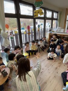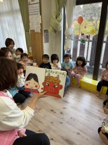 『まめまきぱーらぱら』の絵本を見て、みんなで『おには~そと❕』と元気よく声を出していました
