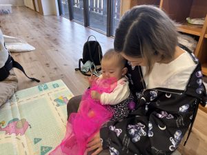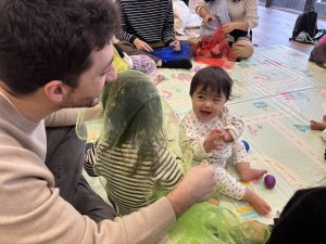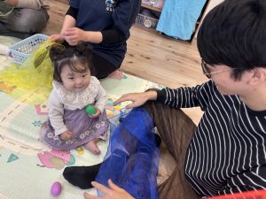 ひよこ組のふれあい会はエッグマラマスやスカーフを使って親子で楽しんでもらいました。
