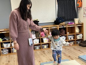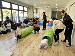 楽しい雰囲気の中お家の方と一緒にマットに乗ったり、平均台を渡ったり、最後は親子で力を合わしてアンパンマンのボール投げをしました。