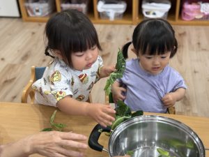 実際に触ってみたり、ちぎってみたり、においを嗅いだりし、「ツルツルしてる」「土のにおいがする」など、いろいろな発見があろました!
