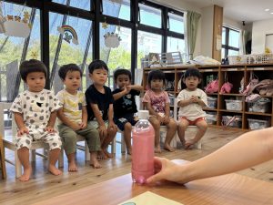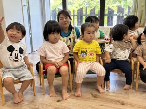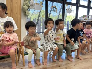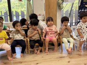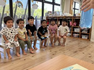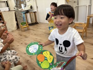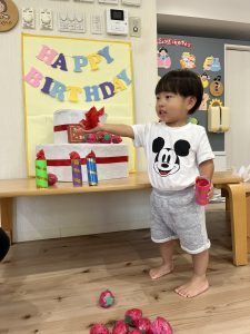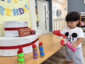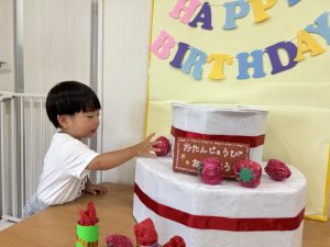 7月生まれのお友だちは一名。みんなの前でケーキにイチゴをポンポンポン。「いちごー」と言いながら楽しんで乗せていました。