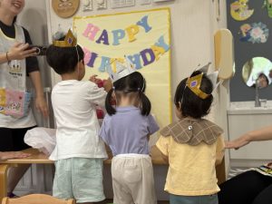 誕生日カードをもらって、みんなからハッピーバースデーの歌のプレゼントがありました。